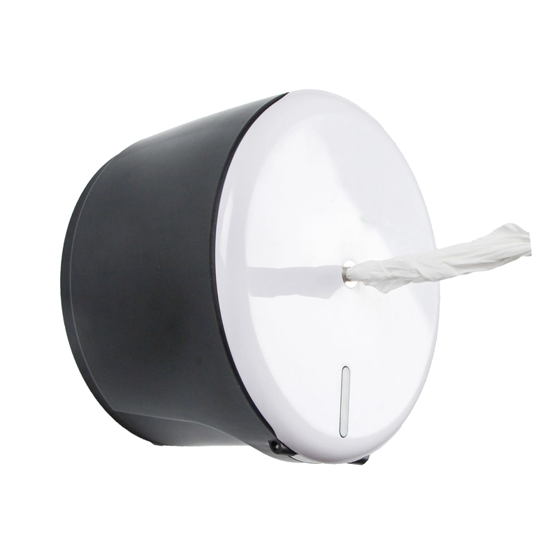 Wall mounted Central Pull Toilet Paper Dispenser. Super save paper design with ABS white or black color.  Users only touch one sheet at a time. Save 40% paper.  Always One-at-a-time dispensing, no break inside.  Frontal inspection slot to indicate refill level. Suitable for public use with high strength and durability.