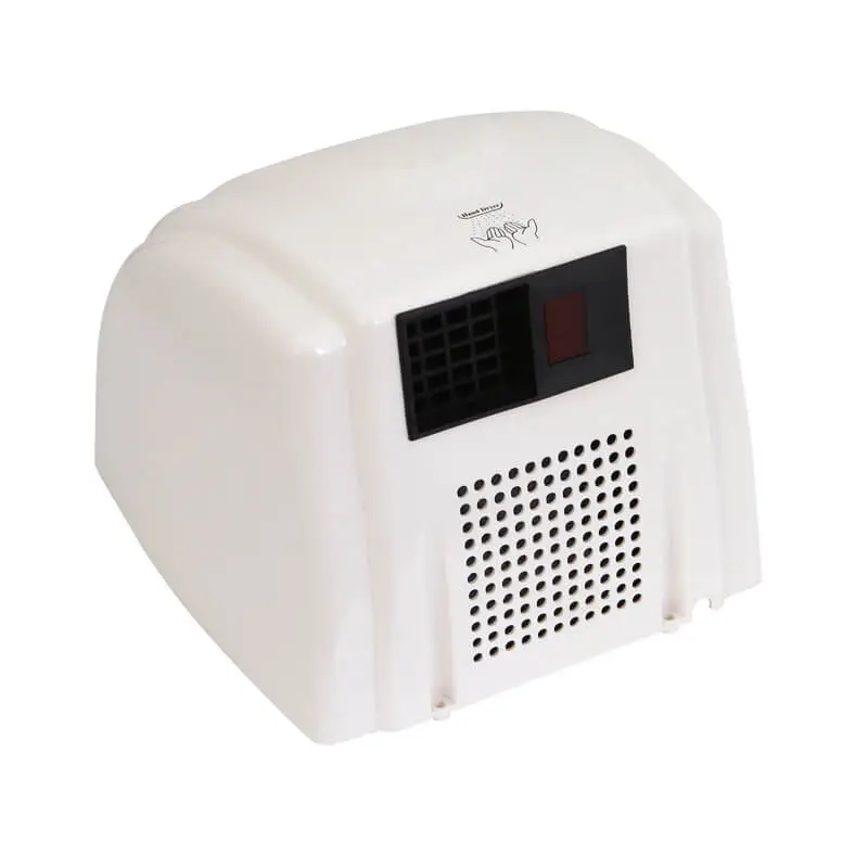 HOTEC infared sensor hand dryer, one-piece cover, durable and antirust. Made of ABS plastic with white finish. Easy installation and maintenance. High speed brush motor incorporating a safety thermal cut-off.
