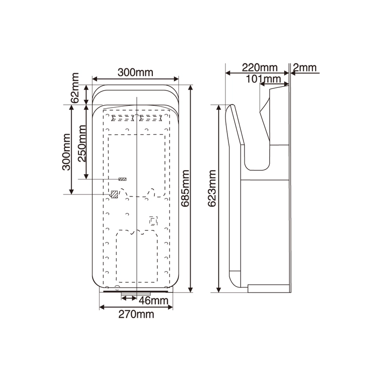 • Dimension: 685 high x 300 wide x 220 deep mm.