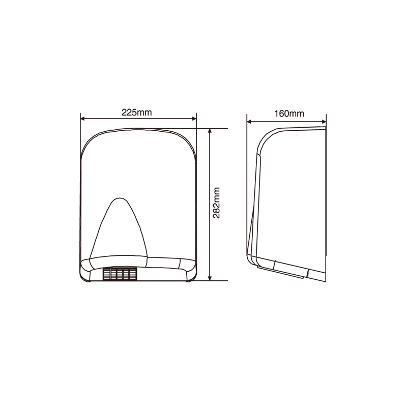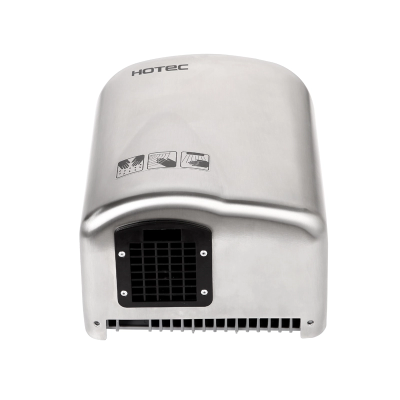 HOTEC touchless hand dryer made of 304 stainless steel with satin finish. Easy to install and maintenance. It is one-piece cover, durability and antirusting including a safety thermal cut-off. High speed brush motor, drying fast.